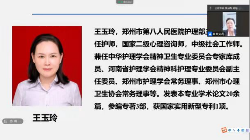 本网讯(文/牛鹏 图/王莉莉)11月30日下午,郑州市第八人民医院护理部王玉玲主任受邀依托腾讯会议为ok138太阳集团中国官方网站师生做《精神科护理实践》专题讲座,ok138太阳集团中国官方网站教师及2019级护理专业学生共300余人参加了此次讲座,讲座由ok138太阳集团中国官方网站副院长秦元梅主持。
