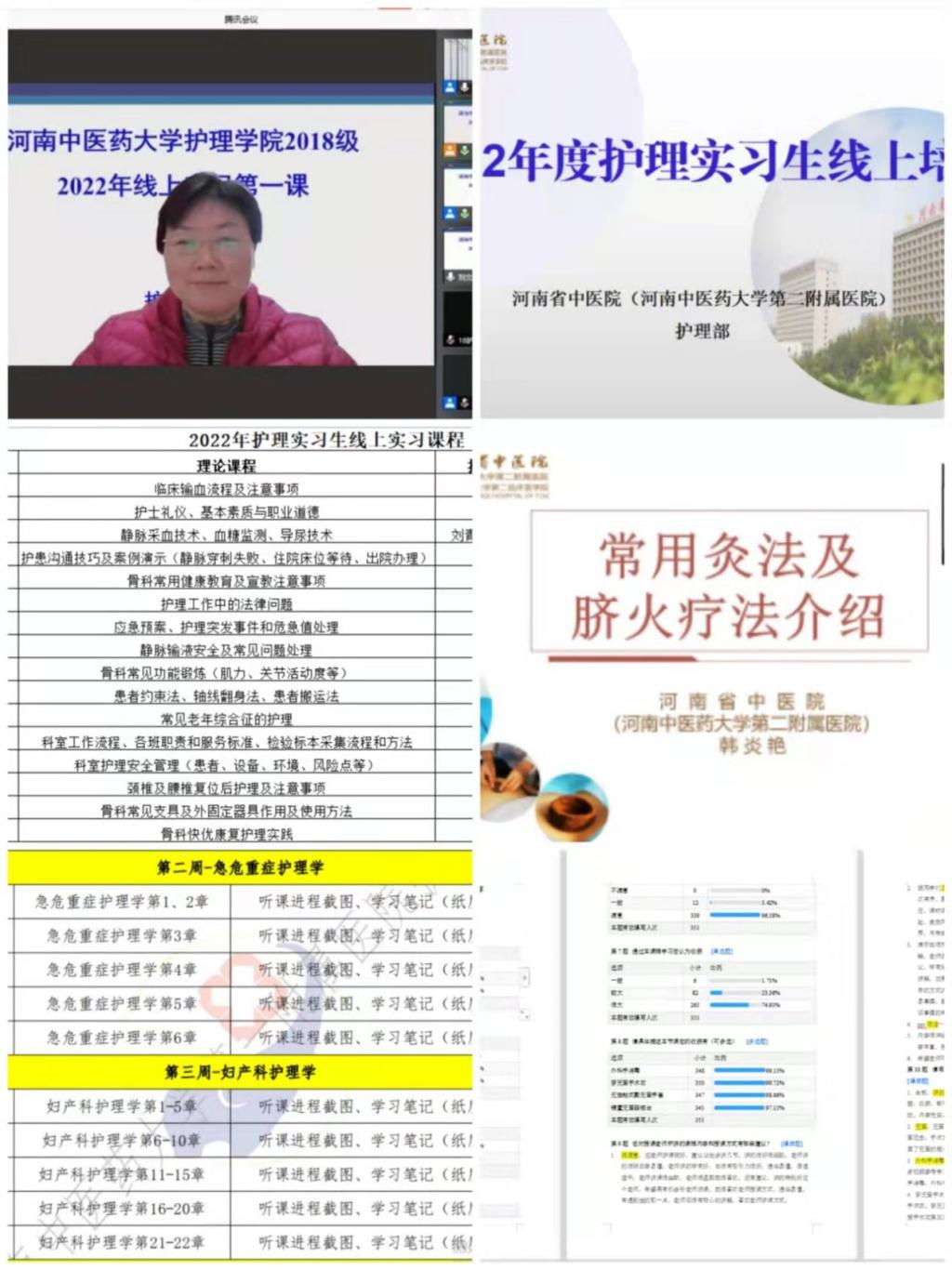 自2022年1月初按学校统一要求,ok138太阳集团中国官方网站暂停省内各基地学生线下实习,我院遵循以学生需求为导向、学院及实习(基地)医院优势互补的原则,采用了ok138太阳集团中国官方网站与实习医院线上实习“双行”模式,各实习医院线上实习以临床护理教学内容为主,ok138太阳集团中国官方网站主要围绕本科毕业论文撰写等相关内容开展讲座。截至目前,郑州市各实习医院线上实习有序进行,学习频次5次每周,医院大多采用教师授课+自学临床相关内容+作业形式,同学们满意度100%。ok138太阳集团中国官方网站遵照院部线上实习毕业工作方案,截至目前共安排了6次论文书写、护士资格考试相关知识讲授,参加学生1500余人次,深受学生欢迎。