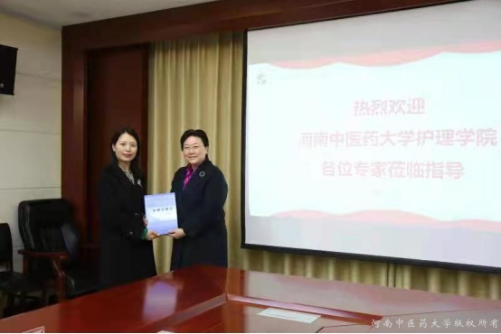 荫晴主任汇报医院实习管理和临床带教工作之前,先推介了医院专门录制的“5.12护士节专题宣传片”,视频中记录了医院领导对护理团队的支持和关怀,展示了护理工作者在各个岗位上温馨、严谨、精彩、忙碌的工作场景,充分展现了附院护理人“团结奋进、敬业奉献、守正创新、追求卓越”的护理文化理念。秦元梅副院长带领教学办老师查看了护理部的带教计划和相关资料,并赠送了学院正在使用的护理专业“十四五”规划教材。