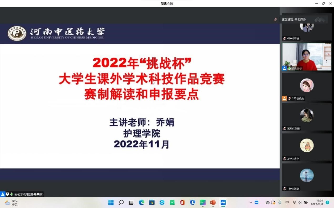 (图/乔博研 文/胡亚静)为进一步提升“挑战杯”大学生课外学术科技竞赛团队备赛质量,帮助同学们打磨参赛作品,提高学院竞赛水平,11月4日晚上,ok138太阳集团中国官方网站组织了“挑战杯”赛制解读和申报要点线上培训。本次培训邀请到了ok138太阳集团中国官方网站乔娟老师为大家讲解。全院学生代表300余人参加学习。